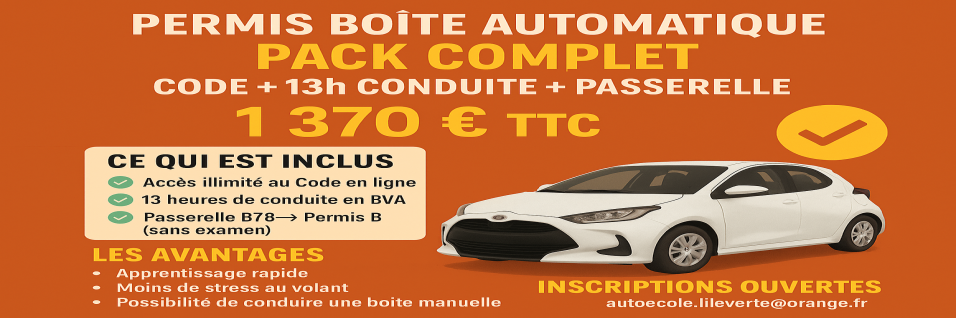 Nous proposons une nouvelle formule avec code + 13h en boite automatique et passerelle pour obtenir le permis boite manuelle.